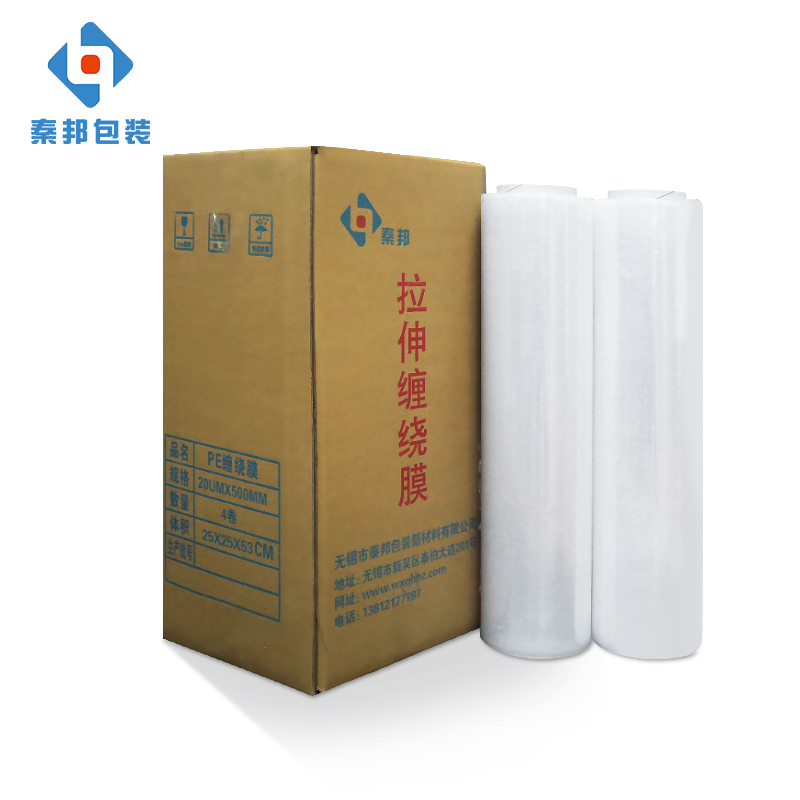 PE拉伸膜/纏繞膜,又稱LLDPE彈性膜/包裝膜,是一種透明、富有彈性及強度且無毒無害的柔軟聚乙烯塑料薄膜,符合國際環保衛生標準,可在不加熱的情況下,進行縱橫雙向冷拉伸,依靠它本身自粘性包裝各種產品,并可使貨物長期保持張力而不至于松散,強度高、彈性拉力大、對任何形狀的物品都能裹緊,裹成一個整體。拉伸包裝比收縮包裝節省材料,且不需要收縮包裝機節省能源;具有良好的防松散、防雨、防塵、防盜等效果。